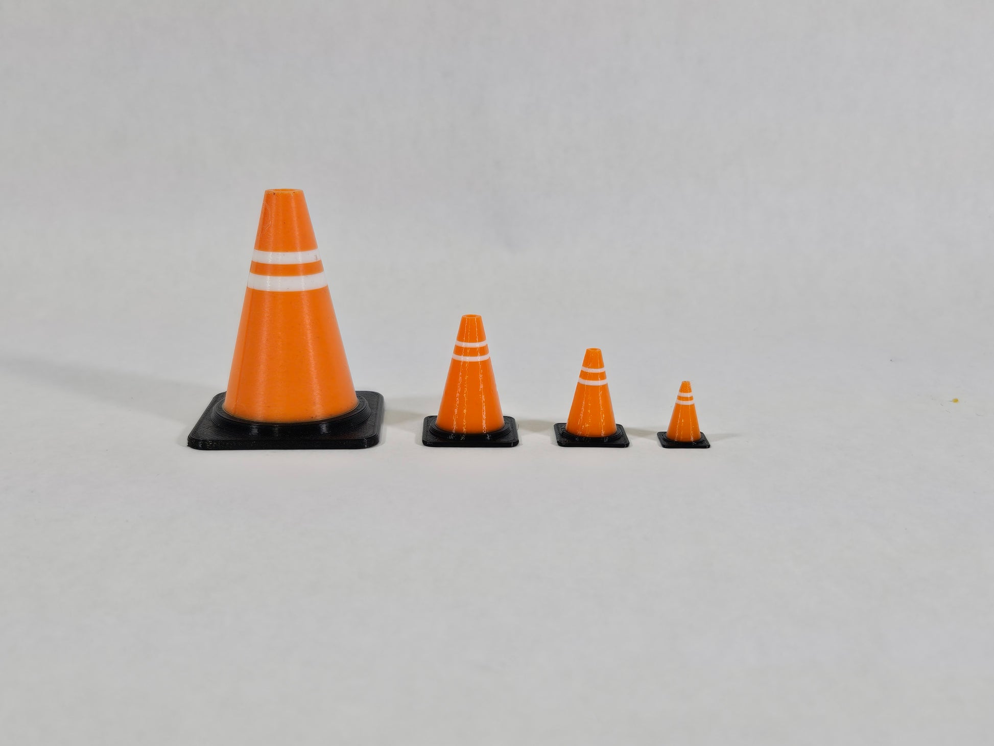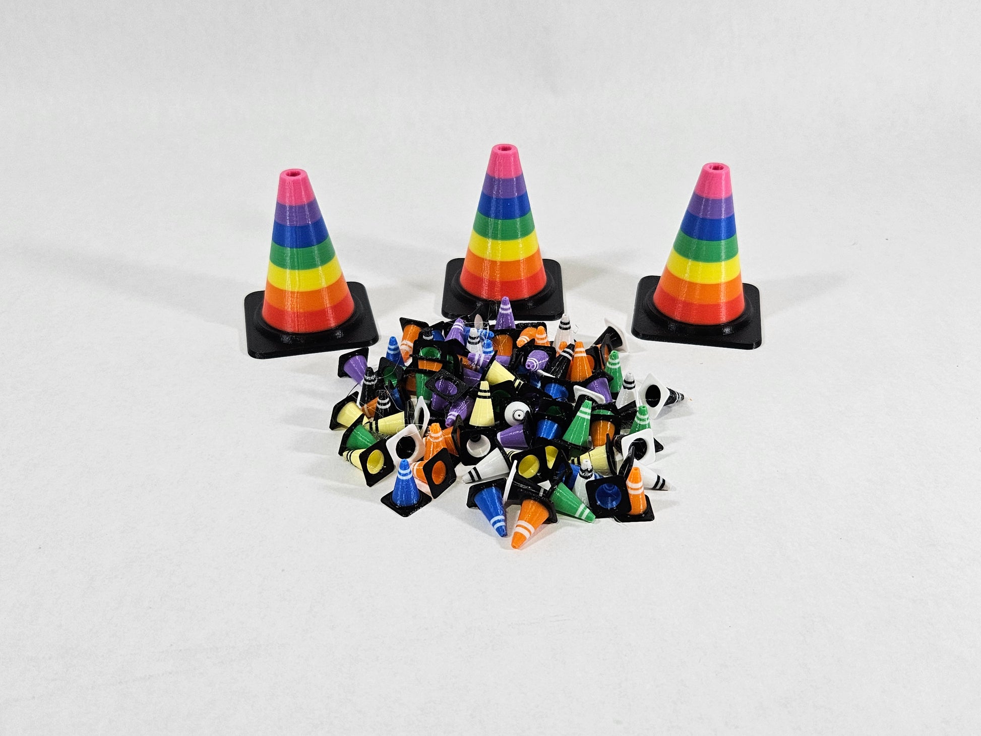 We offer these tiny traffic cones in multiple sizes and colors. If you would like a special color combo just ask! These are 3D printed with light weight plastic. We also have a rubber flexible material available.